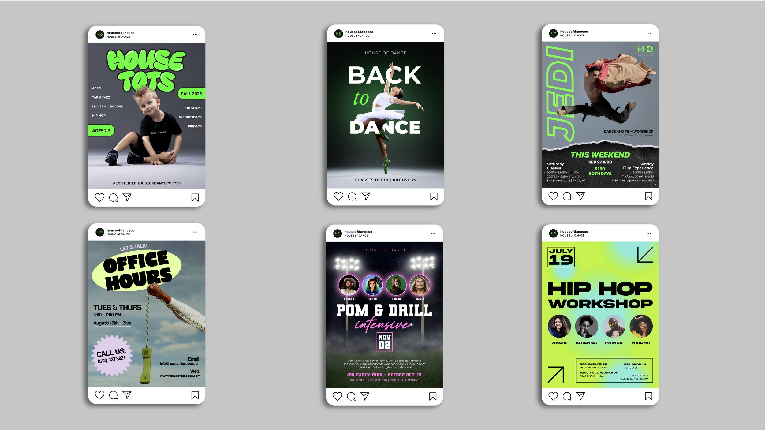 Refresh House of Dance’s brand presence through a modernized website, updated visual direction, engaging social content, and cohesive merchandise—creating a bold, unified experience that reflects the studio’s energy both online and in-person.